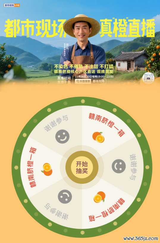 11月25、26日,关注“都市现场”微信公众号,参与大转盘抽奖,即有机会获得1箱赣南脐橙,每天抽取40名粉丝,获奖名单将于第二天公布。